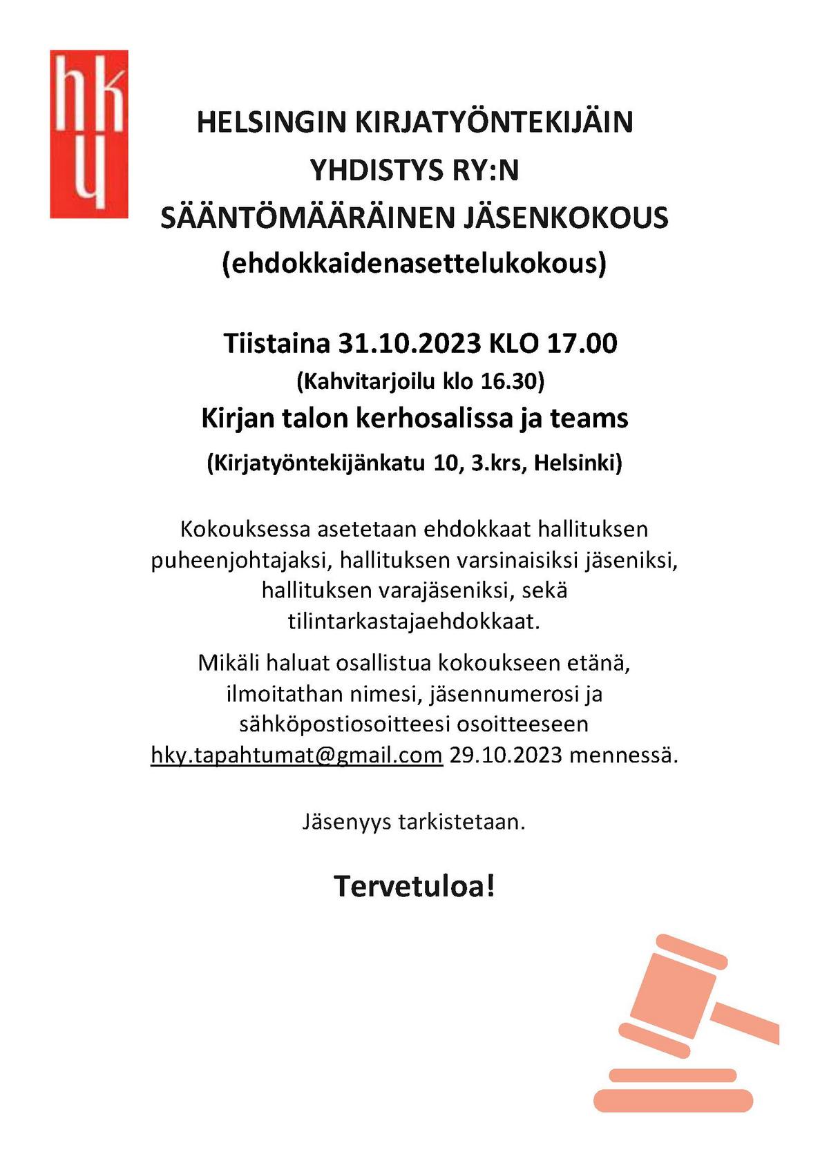 Mikäli haluat osallistua kokoukseen etänä, ilmoitathan nimesi, jäsennumerosi ja sähköpostiosoitteesi osoitteeseen hky.tapahtumat@gmail.com 29.10.2023 mennessä.