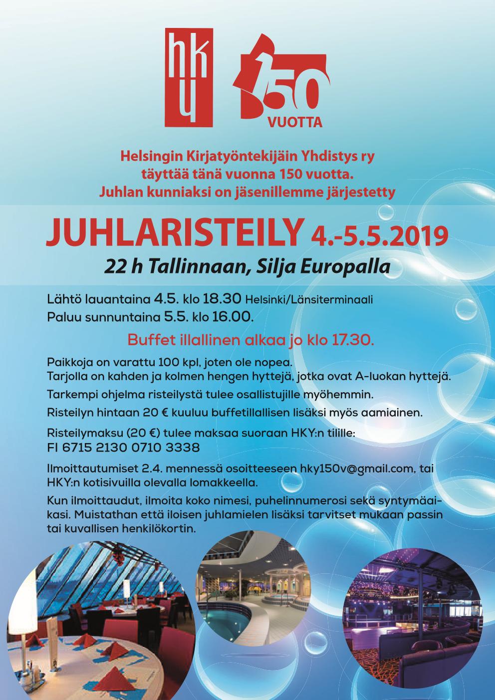 Helsingin Kirjatyöntekijäin Yhdistys ry täyttää tänä vuonna 150 vuotta. Juhlan kunniaksi on jäsenillemme järjestetty juhlaristeily 4.-5.5.2019 22 h Tallinnaan, Silja Europalla.