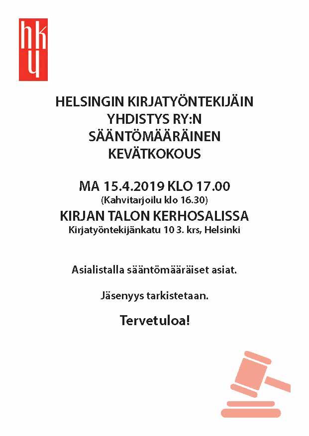 Helsingin Kirjatyöntekijäin Yhdistys ry:n sääntömääräinen kevätkokous maanantaina 15.4.2019 klo 17.00 (kahvitarjoilu klo 16.30) Kirjan talon kerhosalissa (Kirjatyöntekijänkatu 10 3. krs, Helsinki).