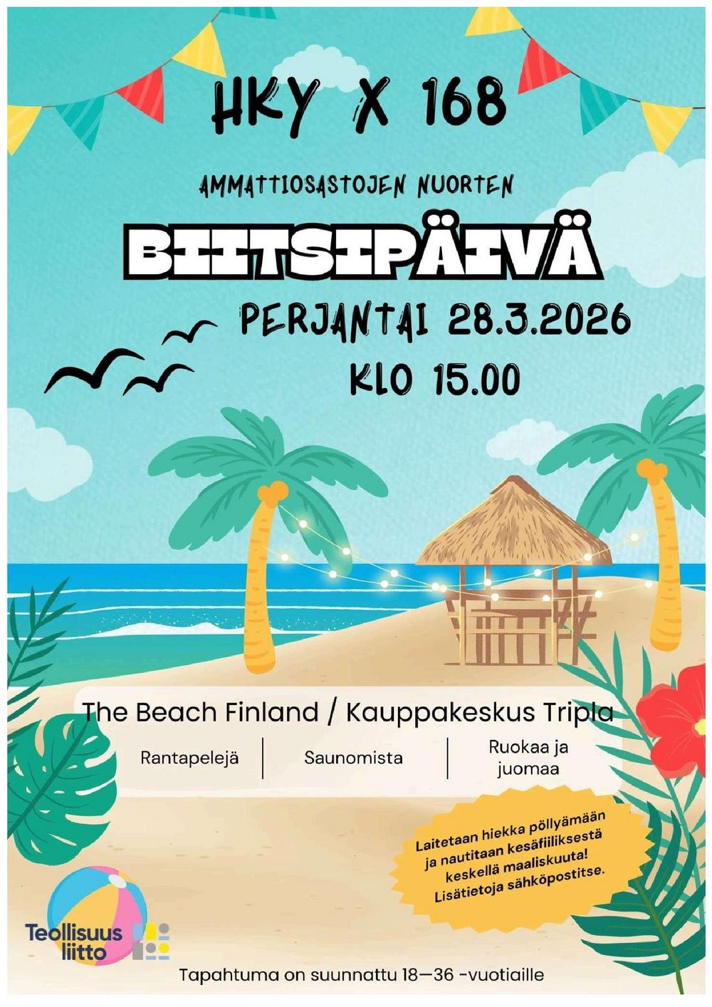 Nyt on aika heittää työvaatteet sivuun ja suunnata hiekalle! HKY:n ja 168:n ammattiosaston nuoriso-vastaavat järjestävät yhteisen rennon iltapäivän Biitsi Pasilassa. Luvassa on hiekkaa, hyvää seuraa ja rentoa meininkiä – satoi tai paistoi! Päivän päätteeksi pääsemme myös nauttimaan Biitsin upeista saunatiloista. Voittaja joukkueelle luvassa kuohuviinipullo!